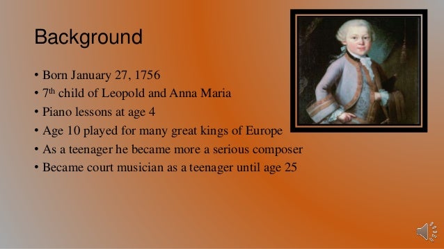 When his mother passed away in seventeen seventy-eight, he returned home where his father had arranged another position for him as court organist. He and his mother set out in seventeen seventy-seven, but he didn’t have much luck. Mozart began to feel unsatisfied with his job and decided to travel all over in hopes of finding something more promising. As a result he had the opportunity to work in many different genres of music to compose symphonies, string quartets, sonatas and serenades and even some operas. In seventeen seventy-three, the archbishop selected young Mozart as assistant concertmaster. His father wanted to showcase his son’s musical talents as a composer and performer to as many people as possible. When he was a child he would travel with his family and perform where he could. In this time Mozart would come to be known as one of the most talented musical composers.